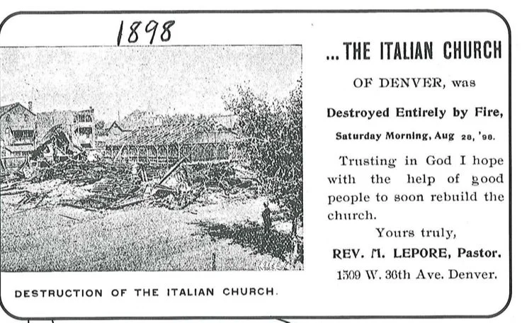 Holding on, however, was not always easy. The first wave of Italian immigrants to North Denver found only the Irish-Catholic Saint Patrick’s Church, where priests did not speak their language and were unfamiliar with the uniquely Italian liturgy. This first wave organized in 1891 as the Mount Carmel Society, under the leadership of Father Mariano Felice Lepore, and devoted their considerable energy and less-considerable money to construction of a neighborhood church. Dedicated on Palm Sunday in 189, this simple wood church burned down only four years later. The Denver Times reported that all of Little Italy mourned: “ ‘Santo Rocco mio; Madonna mia; che disgrazia’” (August 27, 1898).